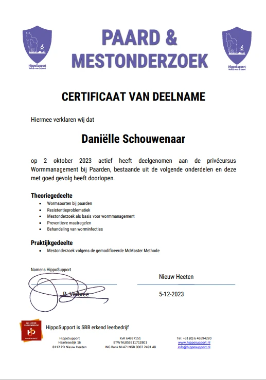 Laatst heb ik een cursus mestonderzoek bij paarden gevolgd om mijn eigen paarden en de pensionpaarden zo goed mogelijk in de gaten te houden en er kort op te zitten, zodat grote wormbesmetting misschien voorkomen kunnen worden. Neem gerust even contact met mij op als u hier gebruik van wilt maken.